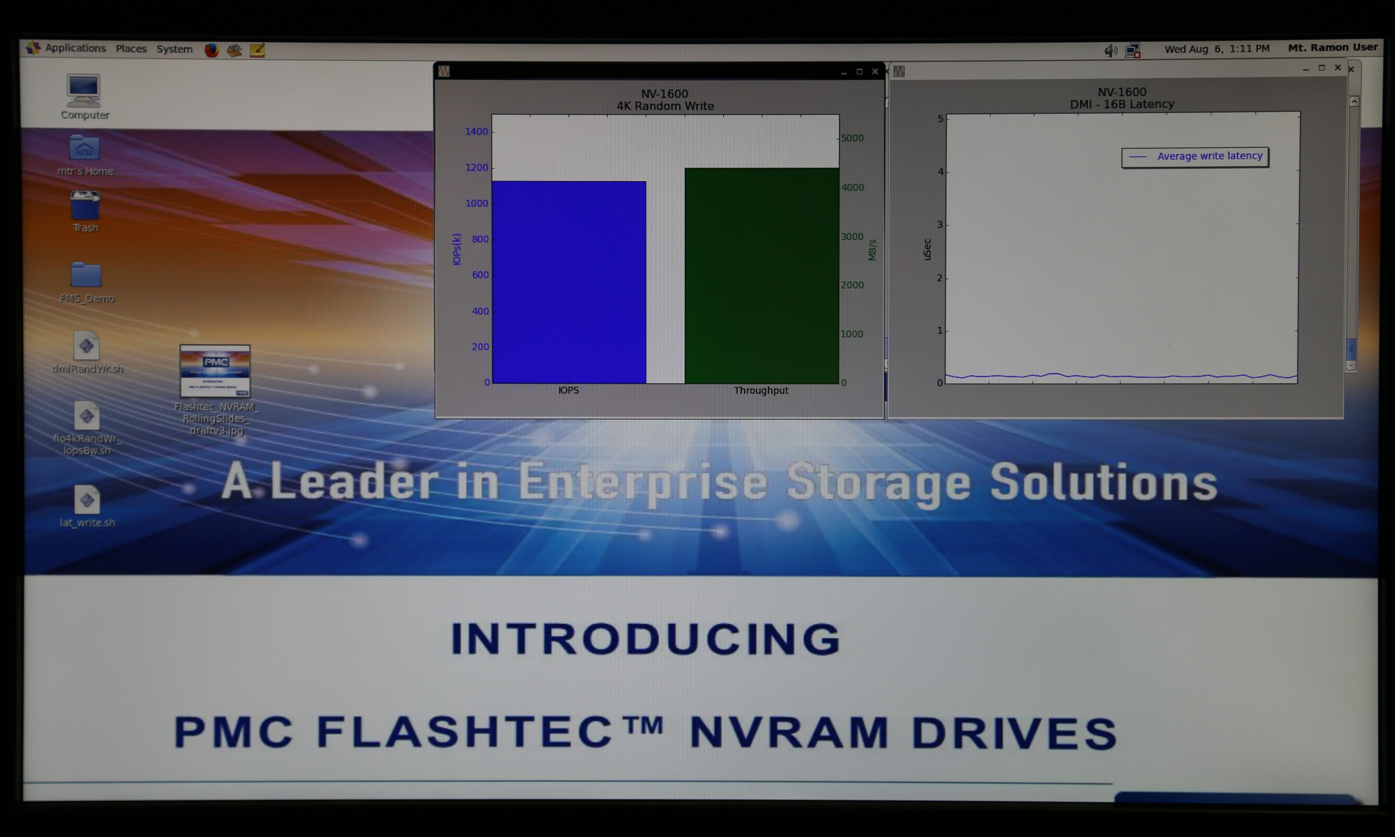 The PMC FlashTec NVRAM is capable of unlimited endurance (as it uses DRAM memory), up to 10 million IOPS, and has flash based backup where a sudden power loss results in no loss of data whatsoever. This was demonstrated at the show and is fully described in our first article.