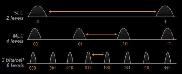 With MLC NAND, we see two bits per cell, but it also makes it a little more difficult for these bits to be read. The advantage to using MLC is cost-related: two times the storage space from the same NAND capacity. By moving to TLC NAND, we now see the cost benefit of another 50% increase in storage capacity as compared to MLC NAND, yet the complexity of reading those bits is even further increased.