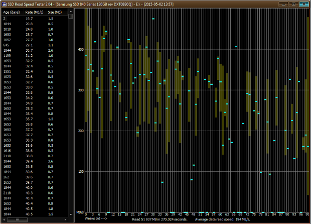 The problem was difficult to detect and identify for a couple of reasons. First, data would have to be around eight weeks old (or older) in order for the read slowdown symptom to appear. Secondly, it was nearly impossible to detect with standard benchmarking software, which works by writing and then re-reading fresh data. You have to love it when the SSD user community gets involved to help identify an issue – PCPer.com’s forum user Techie007 created “SSD Read Speed Tester”, which was able to read already-in-place files and demonstrate the read speed difference between these and fresher data; as well as additional analysis, experimentation and tools from PCPer.com forum user BrainSplatter.