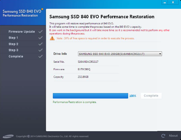 Once Samsung accepted that there was a definite issue, they did get right to work on developing a fix. Several weeks later (10/15/14), Samsung released a firmware update along with a “performance restoration tool”. The firmware update covered both 2.5” (EXT0CB6Q) and mSATA (EXT42B6Q) 840EVO models, and was actually a two-step process. The first part was the firmware update, which modified the algorithm used to compensate for the voltage drift issue. The second step was the “performance restoration tool”, which basically rewrote all the data on the disk to eliminate the old data altogether. Many users first reaction to this step, which turned out to be entirely true, was that this would merely eliminate the problem on a one-time basis, and after another approximately eight week period, the problem did begin to resurface.