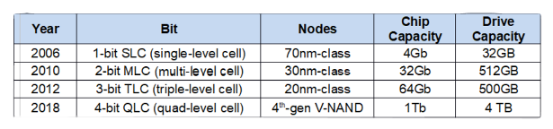 Samsung’s 4-bit 4TB QLC SATA SSD attains and maintains performance levels equivalent to their 3-bit SSDs by utilizing a 3-bit SSD controller paired with TurboWrite technology, and increases drive capacity by using 32 chips that are all based on Samsung’s 64-layer fourth-generation 1Tb V-NAND.