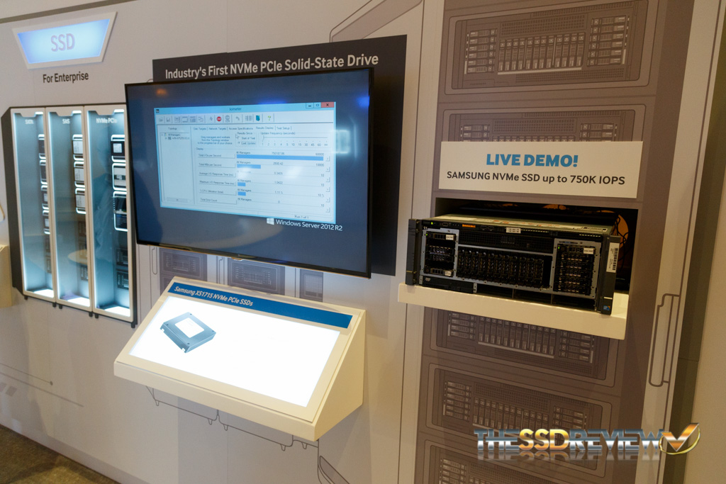 Finally on the SSD side of things, on display was a demo of their XS1715 showing 750K IOPS and 3GB/s speeds via IOMeter. When looking at the average latency, it is at around .34ms and CPU utilization is non-existent at 0%. Essentially, this shows off just how fast NVMe is allowing SSDs to go, even in its infancy.