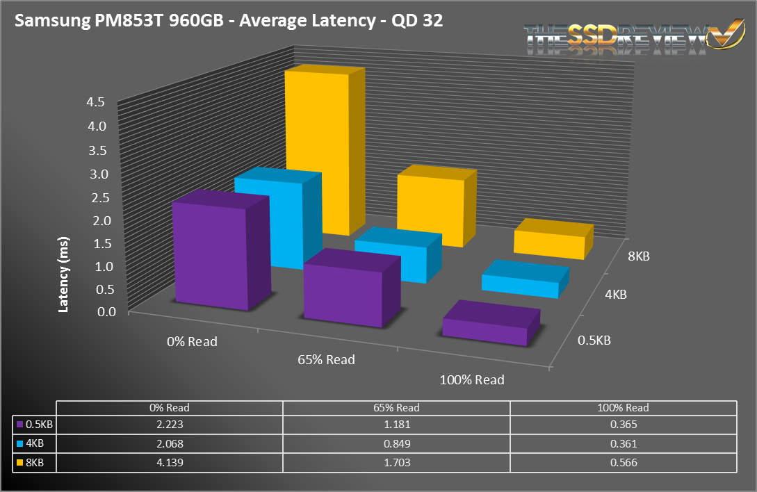 The PM853T posted initial latency results that are in line with what we saw with the 845DC EVO. It was slightly better than the SM843 and the Intel S3500.