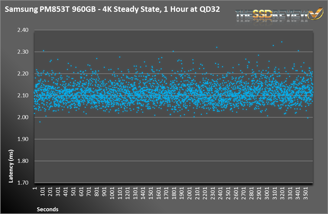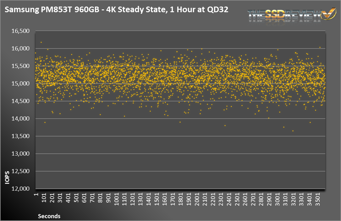 Now we are zooming into the last hour of our testing and looking at 1 second averages. When looking back at our testing on the 845DC EVO, we saw a drive rated at 14K IOPS perform fairly consistently at 15K IOPS. With the PM853T, we see the same average of 15K IOPS, but the grouping of data points is much more compact leading to a lower standard deviation. This is one area where the tweaking of the firmware has led to a noticeable and measurable result.
