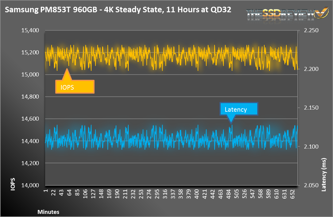 As we talked about in our Micron P400m SSD Review, SSDs have different performance states. Since the Samsung PM853T is an enterprise SSD, we will focus on steady state performance. With the following tests, we stressed the drive using random 4KB write workloads across the entire span for at least 24 hours. This is more than enough to achieve steady state. The following graph is showing the latency and IOPS across an 11 hour span.