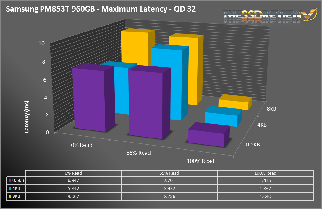 As with the 845DC EVO, the 853T scored very solid numbers in our maximum latency tests. The maximum latency was slightly lower across the board than the 845DC EVO. Once again, there are so few differences that between the two that these results were not surprising.