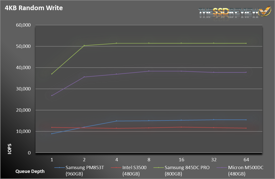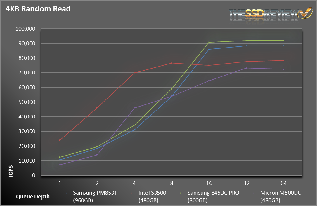 Like the 845DC EVO, the PM853T couldn’t really come close to the M500DC or the 845DC PRO for random write performance. Random reads, on the other hand, showed a strong win for the Samsung drives as queue depth increased.