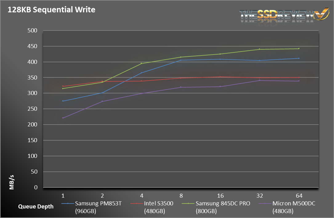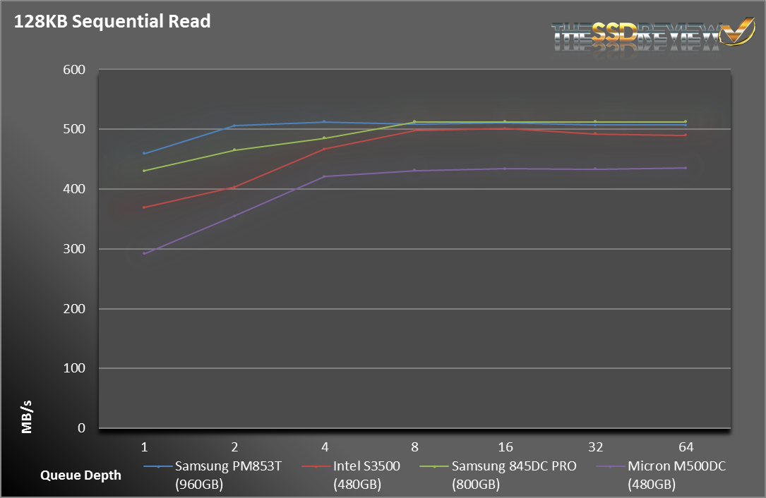 For sequential operation, the PM853T performed just as we expected. It was at or near the top in all of our results. We decided not to show the 845DC EVO in these charts simply because the results were identical, plus or minus a few MB/s.