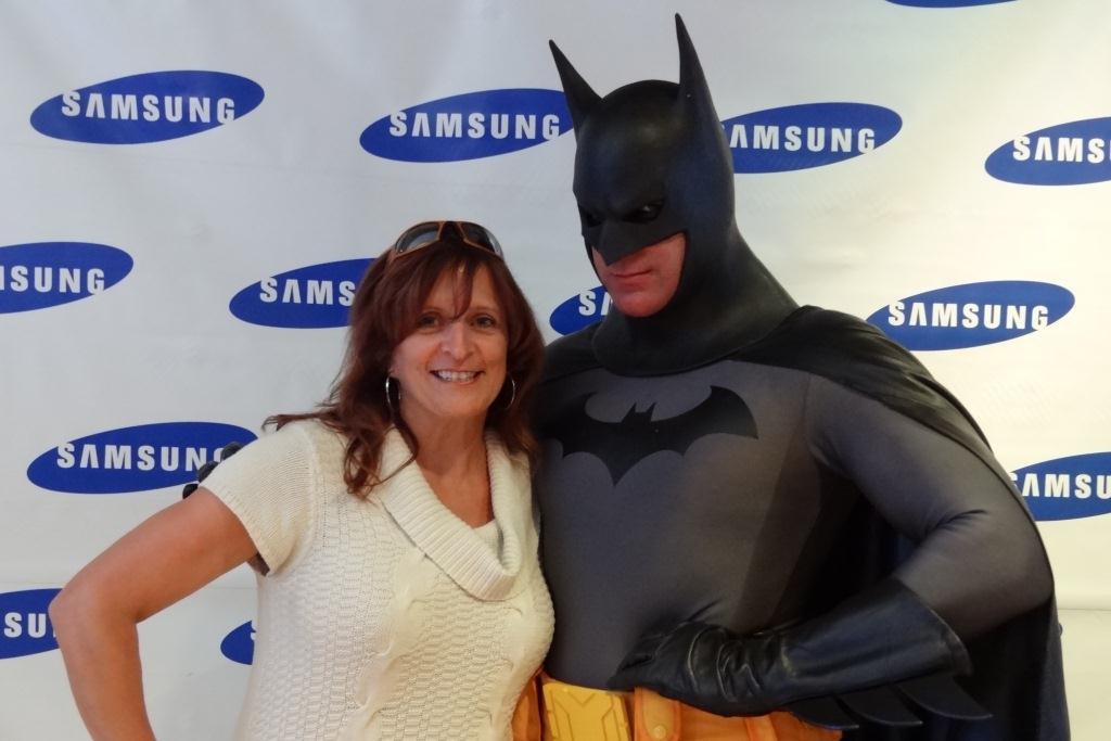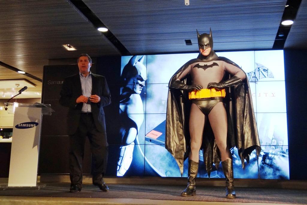 The official release was made by Samsung’s own Senior Vice-President of Mobile Entertainment Reid Sullivan who was quickly overshadowed by the Caped Crusader himself. As seen here, our Associate Editor couldn’t resist the opportunity for a later photo op with Batman who easily stood 6’5″ and fit the part to a tee. This guy was big!