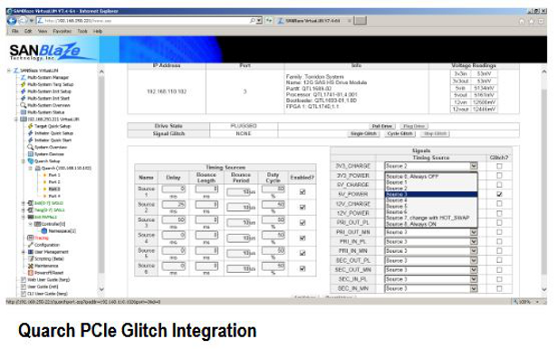 The SBExpress hardware also provides full power management under software control, with continuous current, voltage and power draw measurement of each device under testing. Adding the optional Quarch™ riser allows for signal glitching on all PCIe signals, and Quarch integration with SANBlaze’s VirtualLUN™ software allows for glitching, PCIe lane failure, and drive removal operations (both controlled and surprise) to occur during testing.