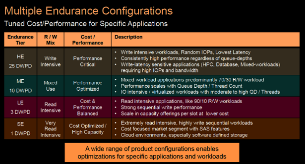Seagate is offering the 1200.2 series of SAS SSDs in capacities ranging from 200GB up to 3.8TB, and in four different endurance levels — up to 25 drive writes per day (DWPD), up to 10 DPDW, up to 3 DWPD and up to 1 DWPD. All of the 1200.2 series of SAS SSDs utilize Micron eMLC NAND paired with a Seagate controller. Performance varies by both capacity and endurance level. Dual-channel sequential read speeds of both the 25 DWPD and 10 DWPD versions are stated as (up to) 1800 MB/s, with sequential writes speeds of either (up to) 800MB/s or (up to) 600MB/s. Random 4K read speeds are stated as either (up to) 205,000 or (up to) 210,000 IOPS. Random 4K write speeds are stated as (up to) 70,000 IOPS.