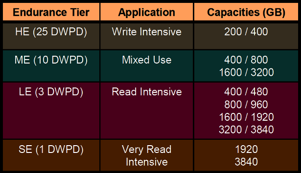 For the 3 DWPD versions, sequential read speeds are stated as (up to) 1750MB/s. Sequential write speeds vary from (up to) 390MB/s to (up to) 750MB/s. Random 4K read speeds vary from (up to) 170,000 to (up to) 190,000 IOPS. Random 4K write speeds are stated as (up to) 35,000 IOPS for this endurance level. The 1 DWPD version attains sequential read and write speeds of (up to) 1700MB/s and (up to) 500MB/s, respectively. Random 4K read speeds are at (up to) 140,000 IOPS, with random 4K write speeds at (up to) 15,000 IOPS.