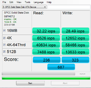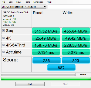 The Slim S80 is able to achieve over 500MB/s (515) read speeds, and 450MB/s write speeds. 4K-64 thread IOPS come in at 40,000 for reads, and over 58,000 for writes. The total AS SSD score of 687 is acceptable, especially when considering the S80’s price point.