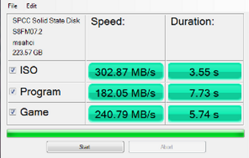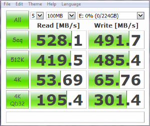 Crystal Disk Mark shows us strong read and write results for both the “zero-fill” and for the “random” test runs, with both achieving over 500MB/s reads. Random results are less than 5% lower than the zero-fill results, showing excellent consistency for a value-oriented drive. One area where SSDs put HDDs to shame is the random 4K results. Many spinning-platter HDDs cannot even achieve 1MB/s read speeds, while the Slim S80 hits 53MB/s (zero-fill) and 24MB/s (random) read speeds. The 4K write speeds are very consistent at 65MB/s (zero-fill) and 62MB/s (random).