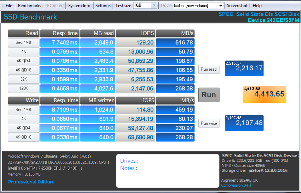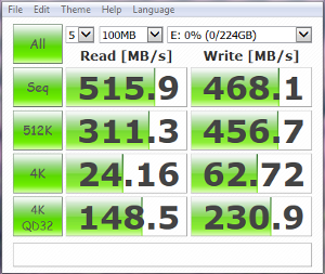 Anvil shows remarkably similar total results for both read and write, with both around 2200 points. The sequential read speeds of 516MB/s and write speeds of 459MB/s are very similar to the AS SSD results. We do see better IOPS performance with this drive using Anvil, with reads topping out at a little over 50,000; and writes topping out at over 68,000. The total score of 4413 is middle-of-the-pack as compared to all drives, but is again quite good for a value-priced SSD.