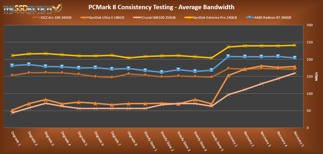 From our PCMark 8 consistency testing, the performance of this drive is up there with the best, almost as good as the SanDisk Extreme Pro. Latency stays below 0.1ms throughout the tests and bandwidth stays above most of the competition compared.