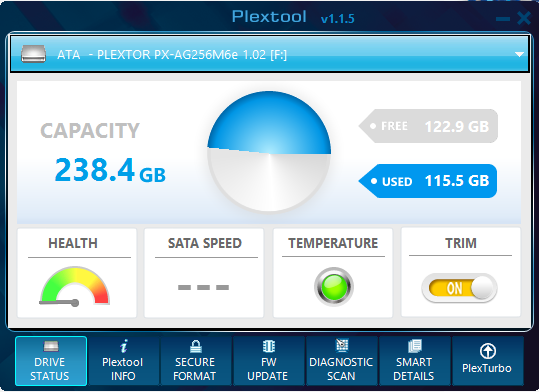 Plextor also has an SSD utility you can download called the Plextool, which allows for monitoring SMART data, secure erase, and check for firmware updates.