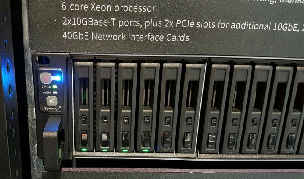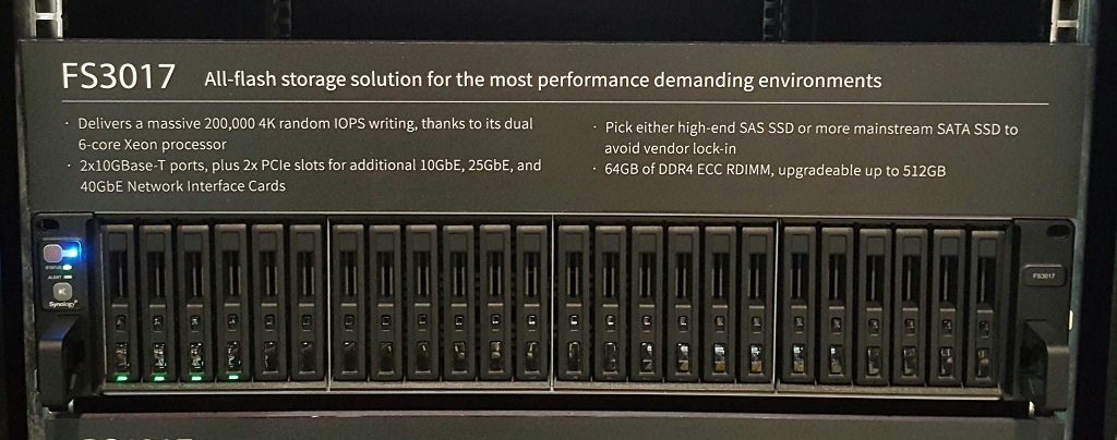 Friday afternoon found us chatting with Steven Peters, Lead Sales Manager for Synology America Corp., a leading producer of network-attached storage (NAS) products. In their South Hall booth here at the Las Vegas Convention Center, they had on display their latest all-flash storage appliance, designated as the FS3017. This 2u rack unit can house up to 24 hot-swappable solid-state drives (SSDs).