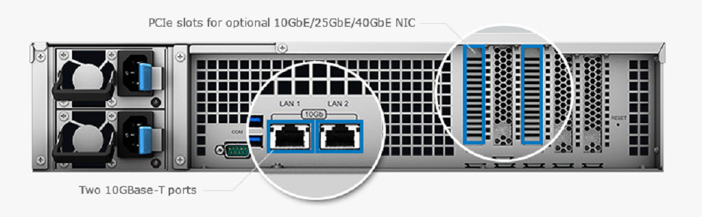 Looking at the back side of this unit, we see 2 x 10GBase-T ports for networking. Two PCIe slots are available to add additional Ethernet controllers if desired, whether 10GbE, 25GbE, or 40GbE. The FS3017 utilizes Synology’s DiskStation Manager (DSM) operating system that offers simplified management of the appliance and drives. It supports all major virtualization solutions, including VMware vSphere, Windows Server, Citrix XenServer and OpenStack Cinder.