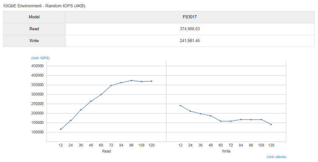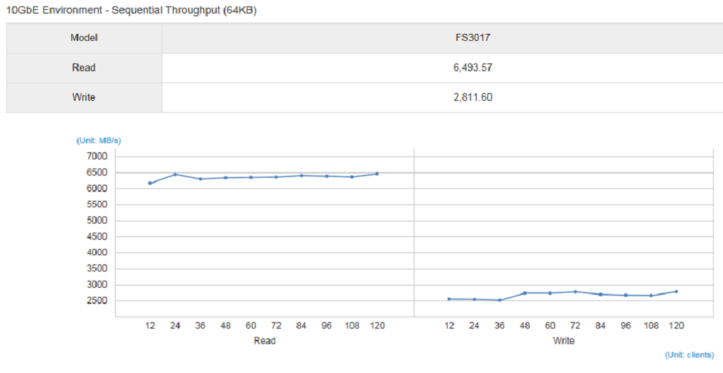 Performance-wise, the FS3017 is capable of sequential read speeds of up to 6493MB/s, and sequential write speeds of up to 2811MB/s. Random 4K read speeds are shown as up to 375,000 IOPS, with random 4K writes of up to 242,000 IOPS.