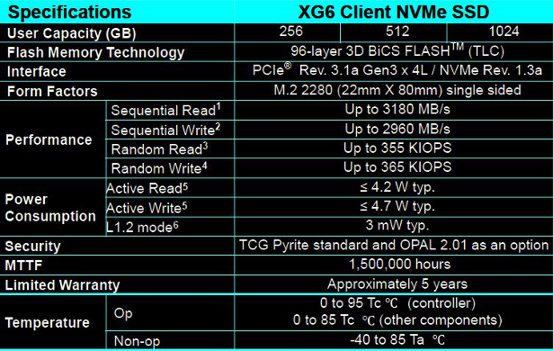 The XG6 series additionally supports TCG Opal version 2.01 via Pyrite or self-encrypting drive models, as well as supporting block SID and digital signature. User-selectable over provisioning is available through NVMe command. An enhanced SLC buffer improves drive performance for client workload applications.