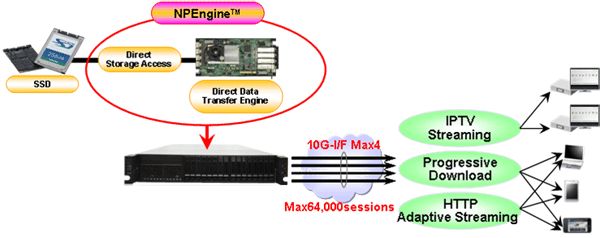 NPEngine is capable of delivering up to 64,000 streams at 40 Gbits per second from SSDs directly to a network, surpassing the capabilities of even the highest performance servers.