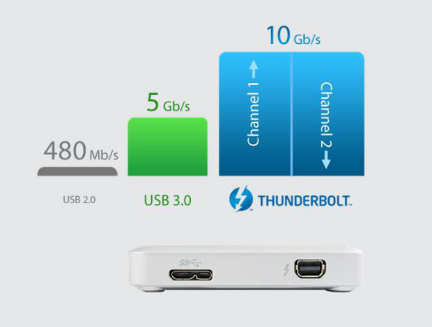 Advanced Thunderbolt technology provides for two channels on the same connector, allowing data to be transmitted and received at the same time, and theoretical transfer rates of up to 10Gb/s (depending on system configuration). The SJM500 also features a USB 3.0 port with UASP support, providing 10 X the bandwidth of a USB 2.0 connection. If the SJM500 is utilized in a Thunderbolt “daisy chain” configuration, it must be the last device in the chain, as it does not have a Thunderbolt pass-through port.