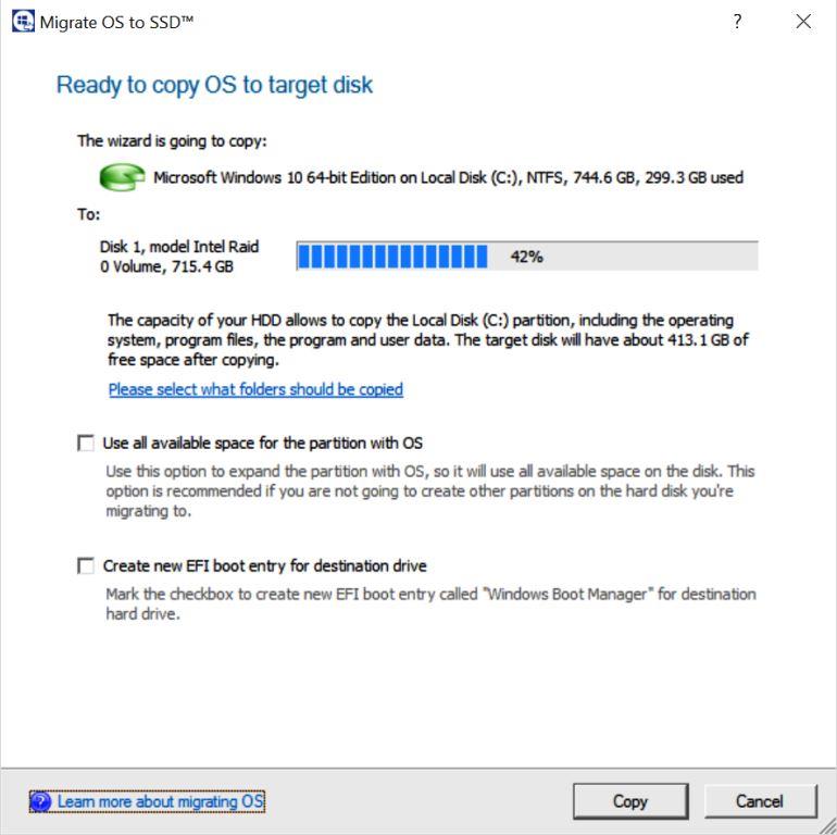 When completed testing of the UEFI RST RAIDx3 configuration, we were able to use Paragon Migrate OS to SSD 4.0 and migrate the OS onto our RAID volume where it functioned without issue as our boot drive (C:)