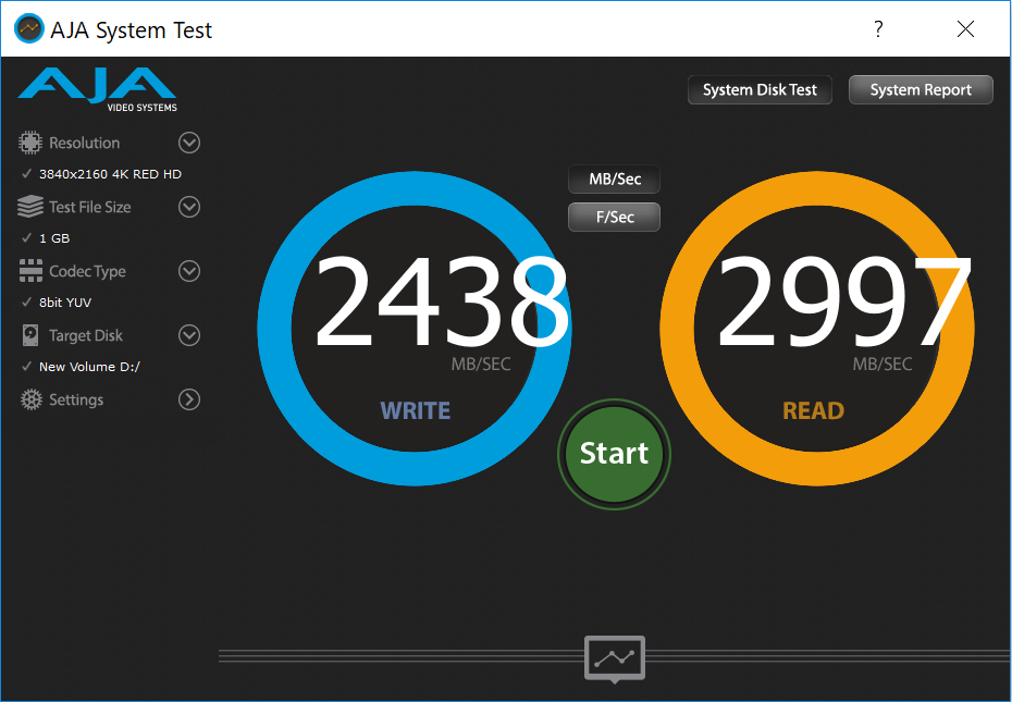 The AJA Video Systems Disk Test is relatively new to our testing and tests the transfer speed of video files with different resolutions and Codec.