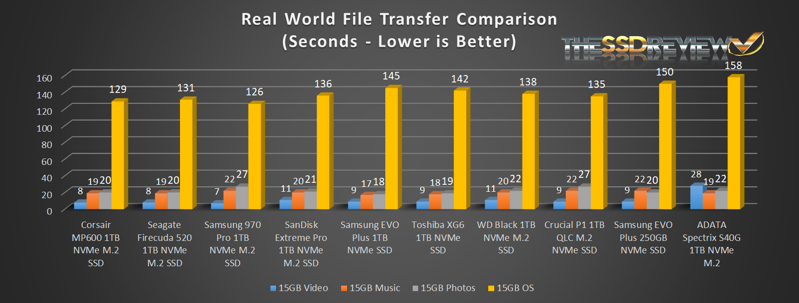 We have put the XPG Spectrix S40G NVMe M.2 SSD beside the best in the business for our true to life data testing. In this test, we simply place 15GB files representing music, video, pictures and operating systems onto the target drive. We then copy each file from one place on the target disk to another, recording the time taken for the transfer.