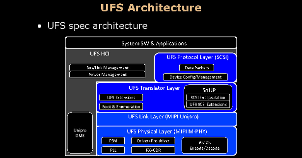 It is managed NAND meaning that it has the controller and interface built in. Overall, it is also a smaller design for mobile devices such as phones, tablets, GPS, etc. UFS is like the next gen of eMMC and both use less power than standard SSDs.