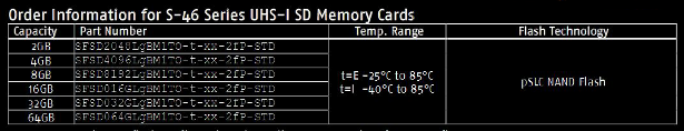 The S-46 SD memory cards are offered in capacities ranging from 2GB to 64GB, and the S-46µ Micro SD memory cards are offered in capacities ranging from 2GB up to 16GB. These cards are able to operate in a storage mode that utilizes only a single bit per MLC cell. This pSLC mode is able to operate much faster than standard MLC mode, and increases the allowed program-erase (PE) cycles of MLC from the specified 3K to as much as 20K. Under similar conditions, the endurance increase some 6.6 X, at a doubled bit cost.