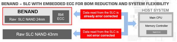 One advantage to Toshiba’s 24nm BENAND is that it requires no ECC from the host controller, allowing it to be utilized even with host controllers that do not support 8-bit ECC capabilities. This makes it an excellent option for companies seeking to design in a next-generation NAND solution, yet utilizing existing hardware. BENAND’s features, including page/block size, spare area size, interface, commands and package are identical to legacy 24nm SLC NAND, enabling simplified migration to the newer BENAND.