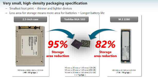 According to Jeremy Werner, vice president of SSD marketing and product planning for Toshiba America Electronic Components, Inc., “We are thrilled to unveil the new BG series with BiCS FLASH which will deliver both a rich feature-set and high performance all within an extremely small footprint and power profile. We expect to be in production this year with BiCS FLASH BGA SSDs, offering our customers a compelling and cost-effective storage solution for the next generation of high performance ultra-thin and light notebooks and tablets