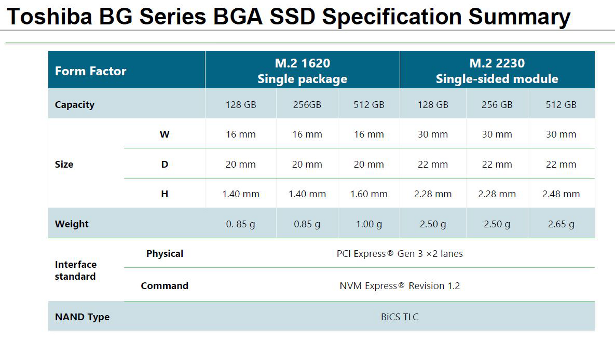 Toshiba’s BG SSD Family is to be offered in capacities of 128GB, 256GB and 512GB in both the 16mm x 20mm package (M.2 Type 1620), or a removable M.2 Type 2230 module. Toshiba is making samples available initially to limited PC OEM customers, and will be available for other customers to develop in Q4 of 2016. You can view the Toshiba press release in its entirety here.