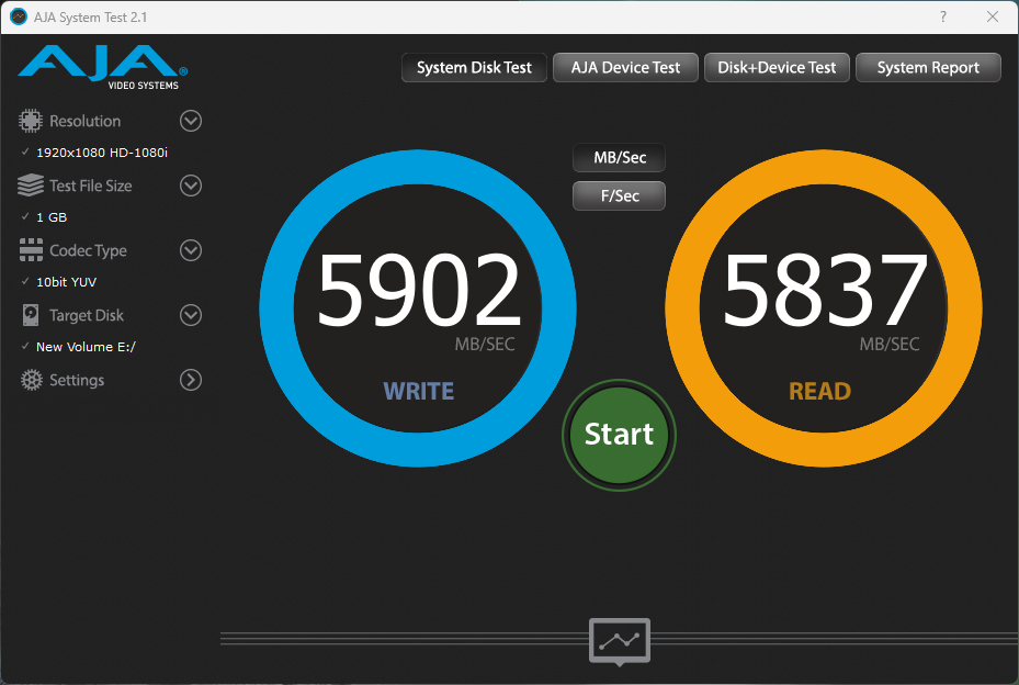 The AJA Video Systems Disk Test is relatively new to our testing and tests the transfer speed of video files with different resolutions and Codec.