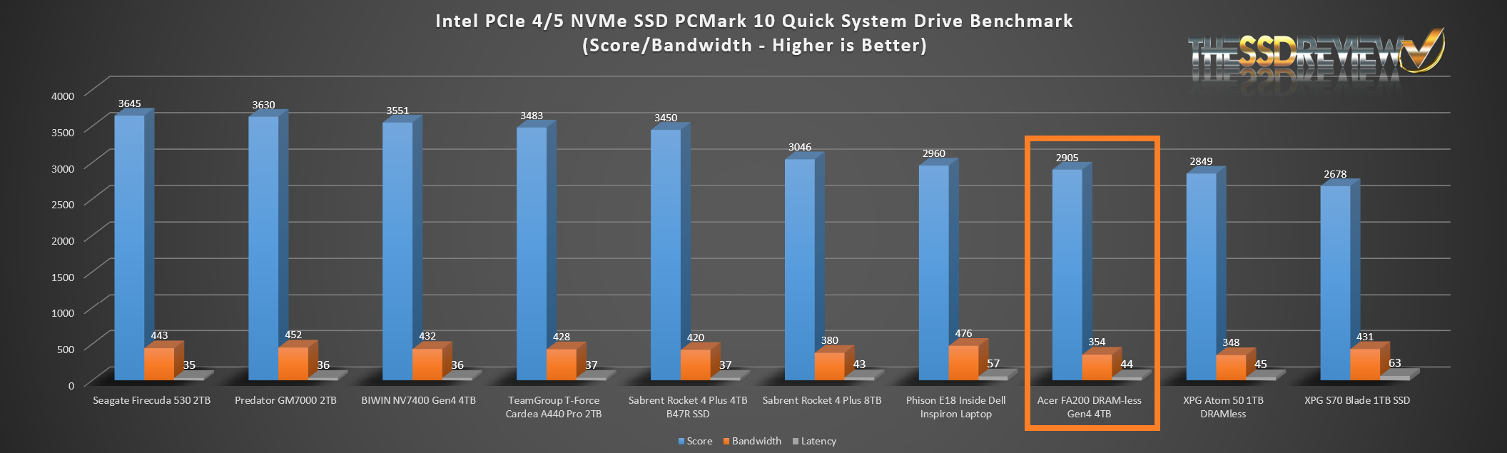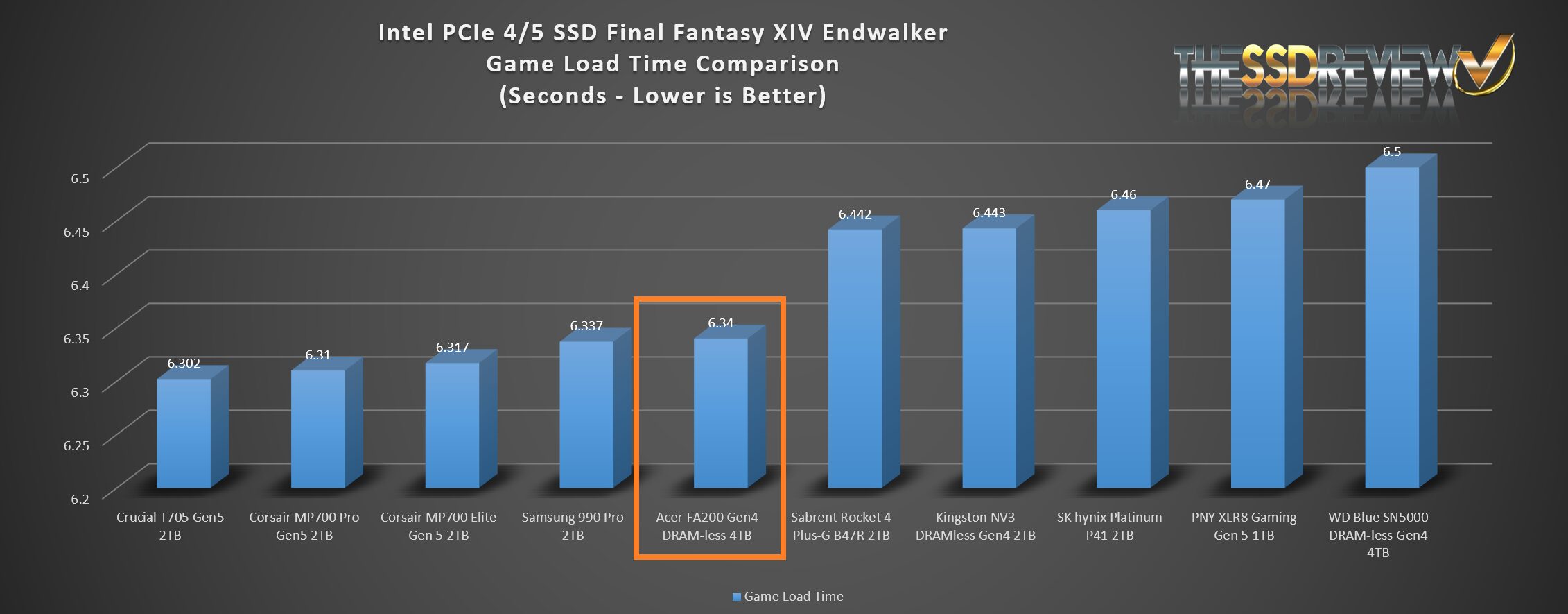 The Acer FA200 placed very well in game load time testing considering it is a mid-level SSD. It placed in exactly the halfway mark of just under 50 SSDs tested to date.