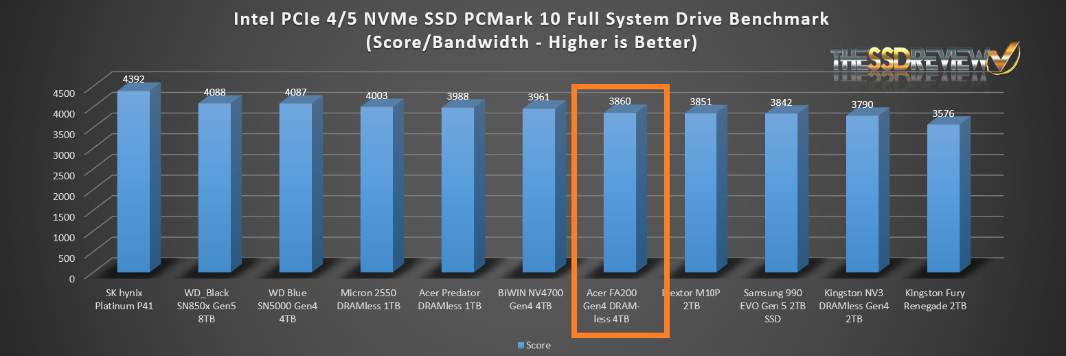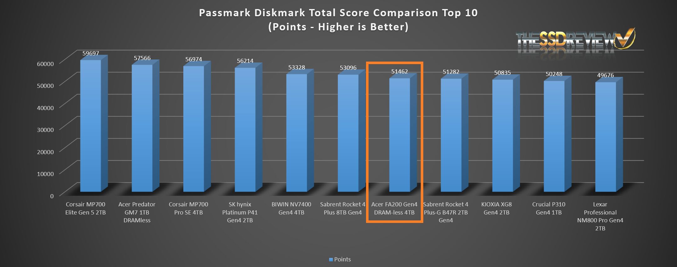 This chart does not depict where the Acer FA200 stand overall, but rather, displays where it stands in comparison to close rivals. The Acer FA200 Gen4 4TB SSD did not fare well in this benchmark, even after several runs.