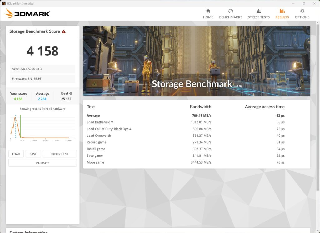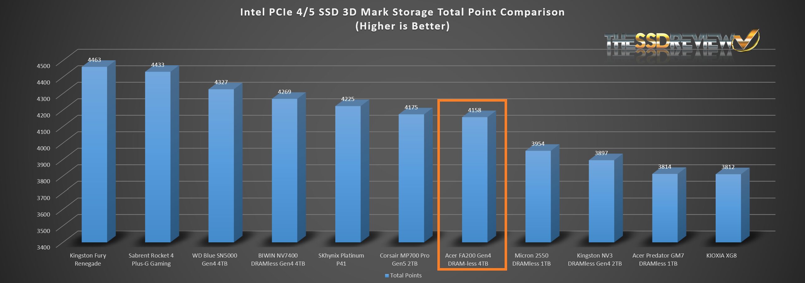 The Acer FA200 placed in the bottom third of 3DMark Storage Benchmark which is what might be expected as this benchmark is the trues real world type test available.