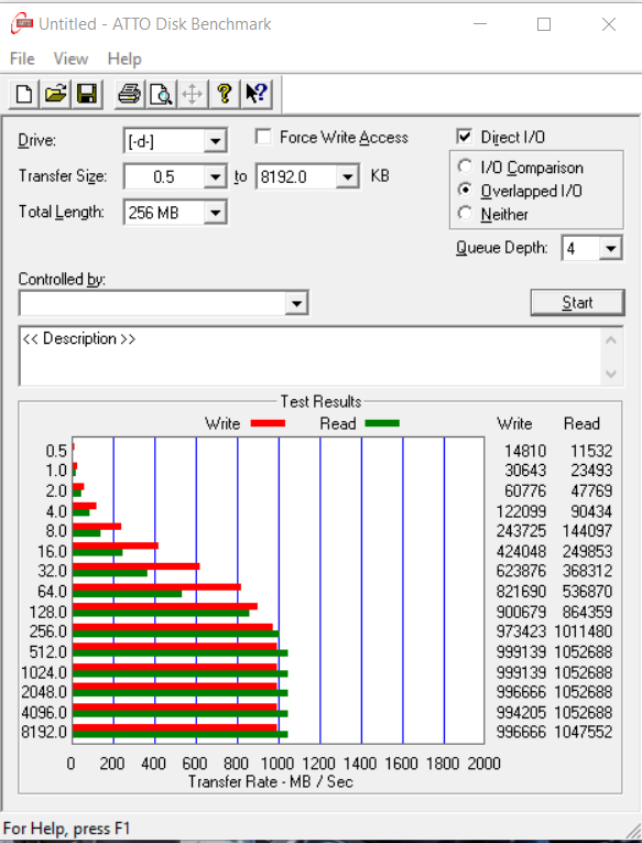 Initial ATTO performance is bang on with the SE 800 reaching 1GB/s read and write disk transfer speeds as advertised.