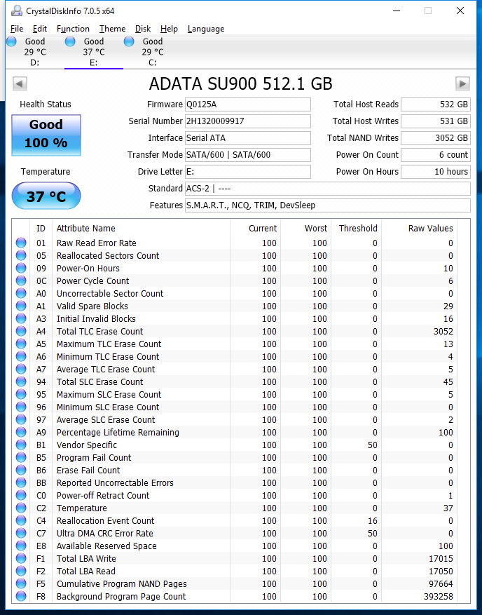 Crystal Disk Info is a great tool for displaying the characteristics and health of storage devices. It displays everything from temperatures, the number of hours the device has been powered, and even to the extent of informing you of the firmware of the device.