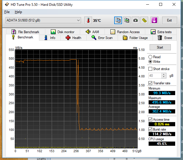 Again, just as we saw with the SU800, the SU900 has a drop-off point as well when it comes to write performance. The SU900’s write buffer, however, is much larger. During a full span write test, it wasn’t until over 260GB of writes that performance dropped off to 100MB/s. Previously the SU800 dropped off to 50MB/s at just over 60GB.