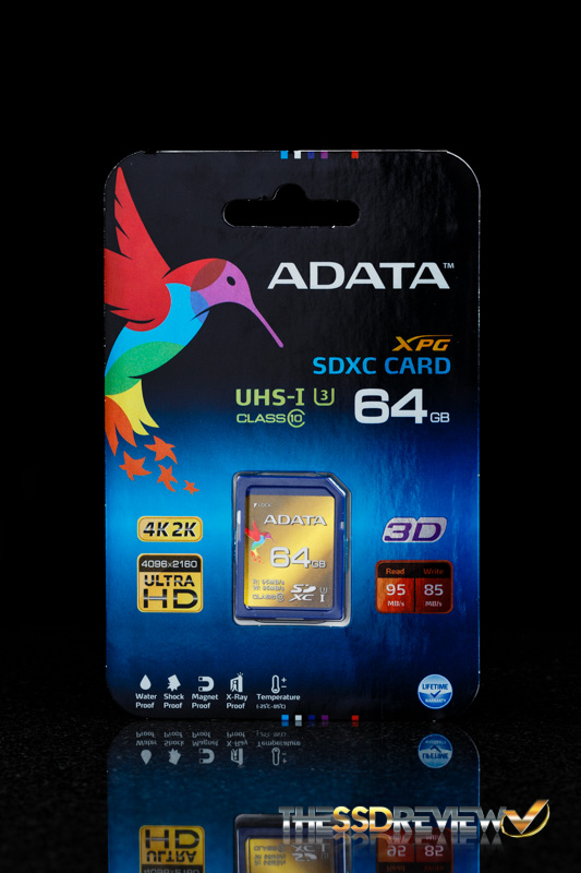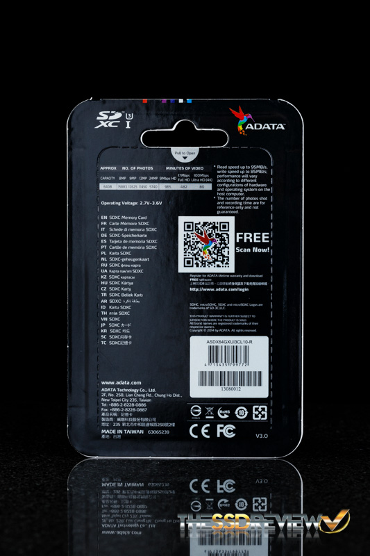 The card comes in a small plastic clamp shell in a perforated cardboard package. The front and states all of the card’s specifications such as the 64GB capacity and the rated speeds. The back reveals a small chart in the top left stating the approximate amount of images and video one can record with the card. For example, it can hold up to 5740 24MP images or up to 80 minutes of 100Mbps 4K video. Also, there is a QR code that brings you the ADATA website where you can register your card for the full lifetime warranty and download free software utilities.