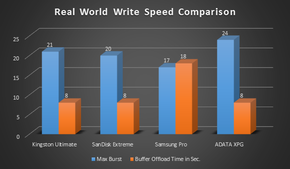 The U3 rating on the ADATA XPG is definitely not just for marketing. As you can see above, the ADATA XPG was able to surpass all the other cards in the burst speed test. It allowed the Canon 6D to capture four 24 shutter bursts in a row during testing. That is three more images per burst than the Kingston Ultimate UHS-I U1 card we recently reviewed.