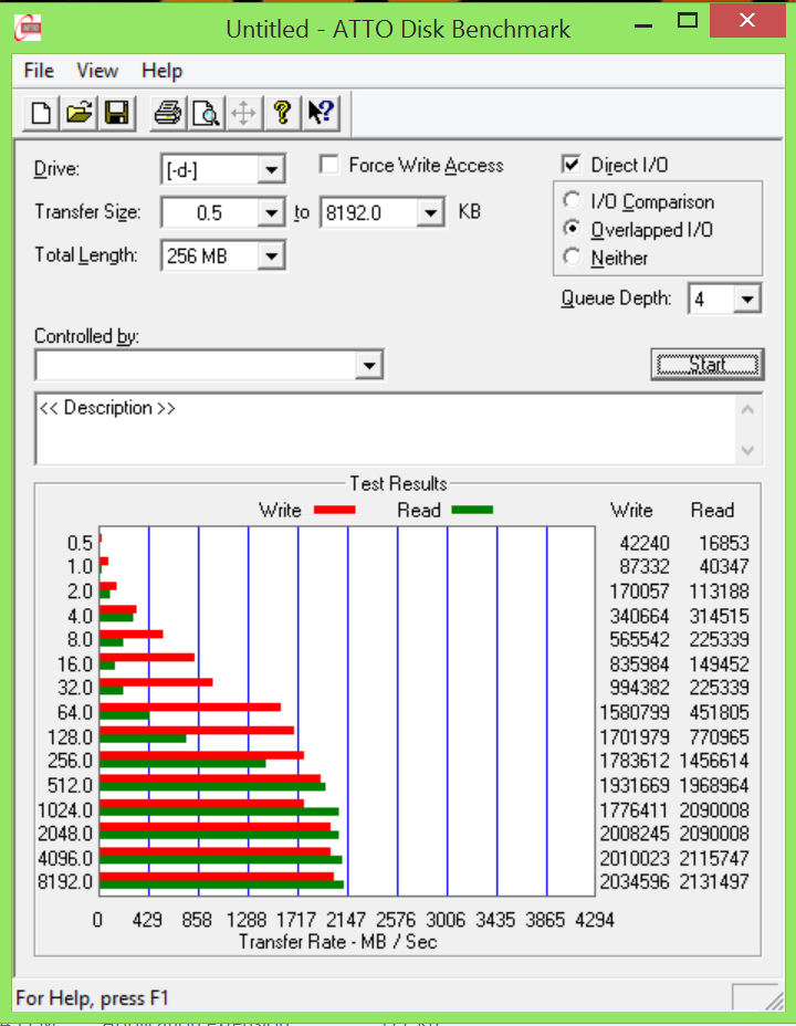 Taking a look at this ATTO Disk Benchmark result, we can see that two Samsung XP941 M.2 PCIe X4 512GB SSDs in RAID 0 were able to achieve both read and write performance over 2GB/s. Another definite plus of this combination is that speeds reach that SATA 3 mark as low as the 4K file size.