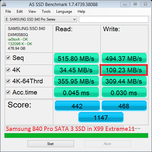 In our report on the ASRock X99 OC Formula, we identified an observation that write performance appeared to be lower than that seen in previous chipsets, especially with respect to low 4K write speeds. Where we originally raved at a Crystal DiskMark 4K write high transfer speed of 359MB/s with the Z97, that dropped to 211MB/s with the X99. Similarly, where we saw the same 4K write performance at 255MB/s in AS SSD, this now dropped to 163MB/s in the X99 OC Formula. The upside, of course, was that where we saw drops in the 4K result, there were significant gains in the 4K-64Thrd data transfer speeds. This 4K drop is most apparent when testing M.2 PCIe x4 SSDs such as the Samsung XP941 (left), whereas we can still achieve low 4K random write performance above 100MB/s in SATA 3 notebook SSDs such as this Samsung 840 Pro (right):