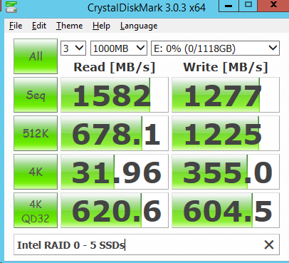When testing the total throughput of the SATA RAID connection we found that it is limited to PCIe 2.0 x4 speeds as expected. The best performance from five SSDs in RAID 0 resulted in 1582MB/s read and 1277MB/s write.