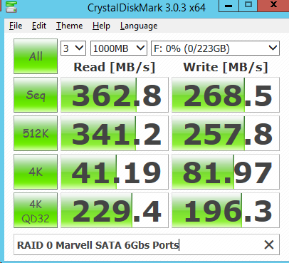 The Marvell SATA throughput results weren’t too surprising to this reviewer. As the link speed from the Marvell 9172 controller is limited to 5Gb/s in reality, you will get results similar to these shown. The highest read speed we were able to reach was 367MB/s while the highest write was 269MB/s. What was quite interesting to find out however was that when the SATA mode was set to RAID we were able to achieve 4K read speeds that are 50% faster than when the SATA mode was set to AHCI. Since the ports allow the SSD to be used as a single drive in the system when the SATA mode is set either way, we suggest that if you do use the Marvell ports, use them with the SATA mode set to RAID.