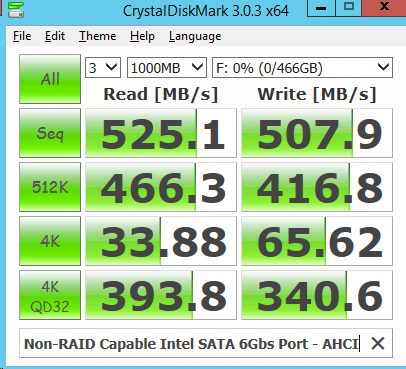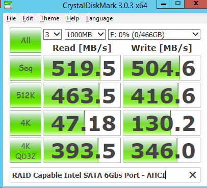 The first result on the non-RAID capable SATA ports shows that most performance is where it should be, however, the 4K read and write is drastically lower than what it could be. Taking a look at the results from the RAID capable ports goes to prove it, there is a 50% loss in 4K QD1 speed.