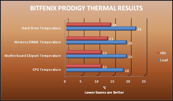 As expected, the Prodigy keeps the system quite cool. For a complete high-end/gaming system, expect the results to be higher, especially when considering discrete graphics cards and overclocking.